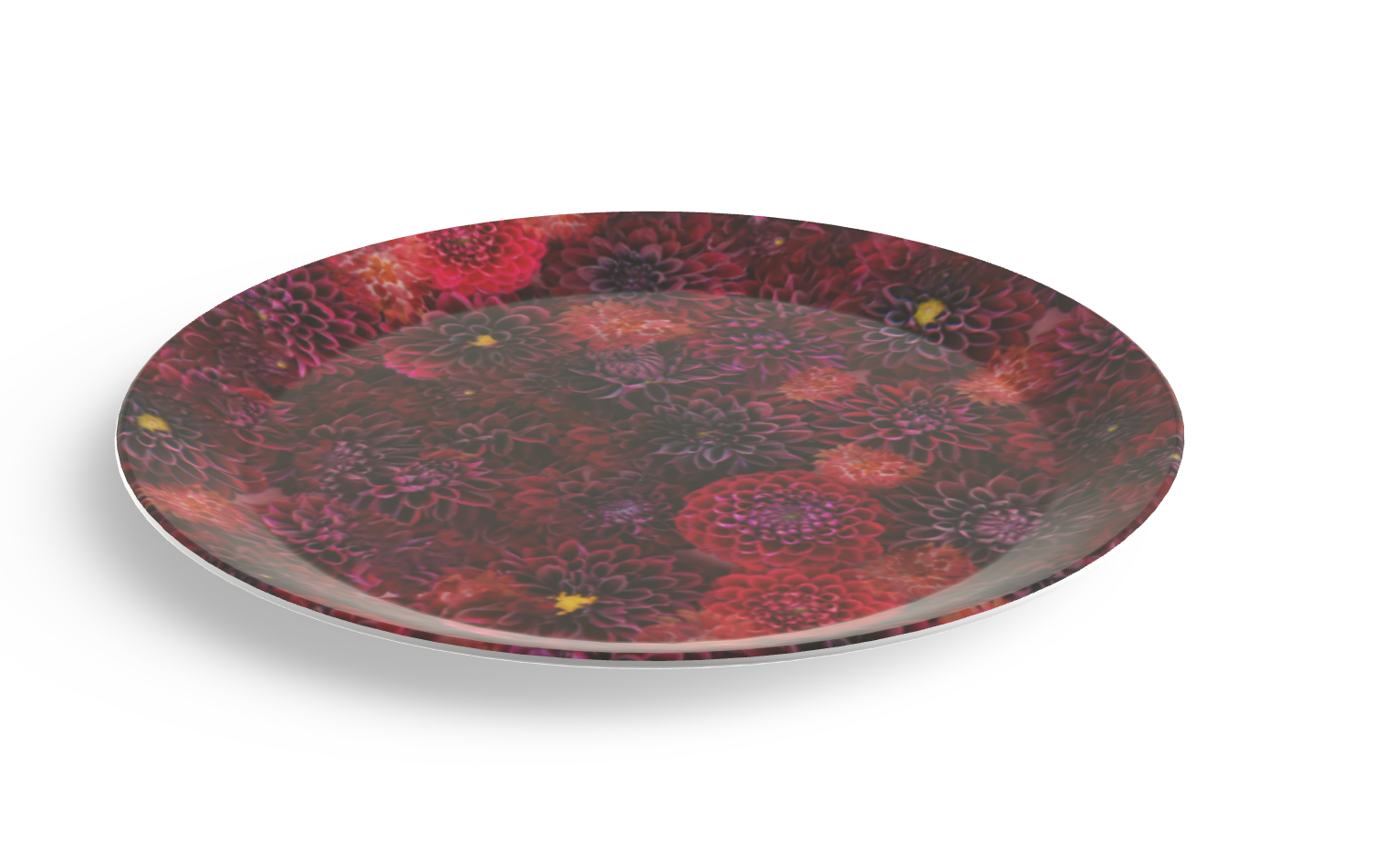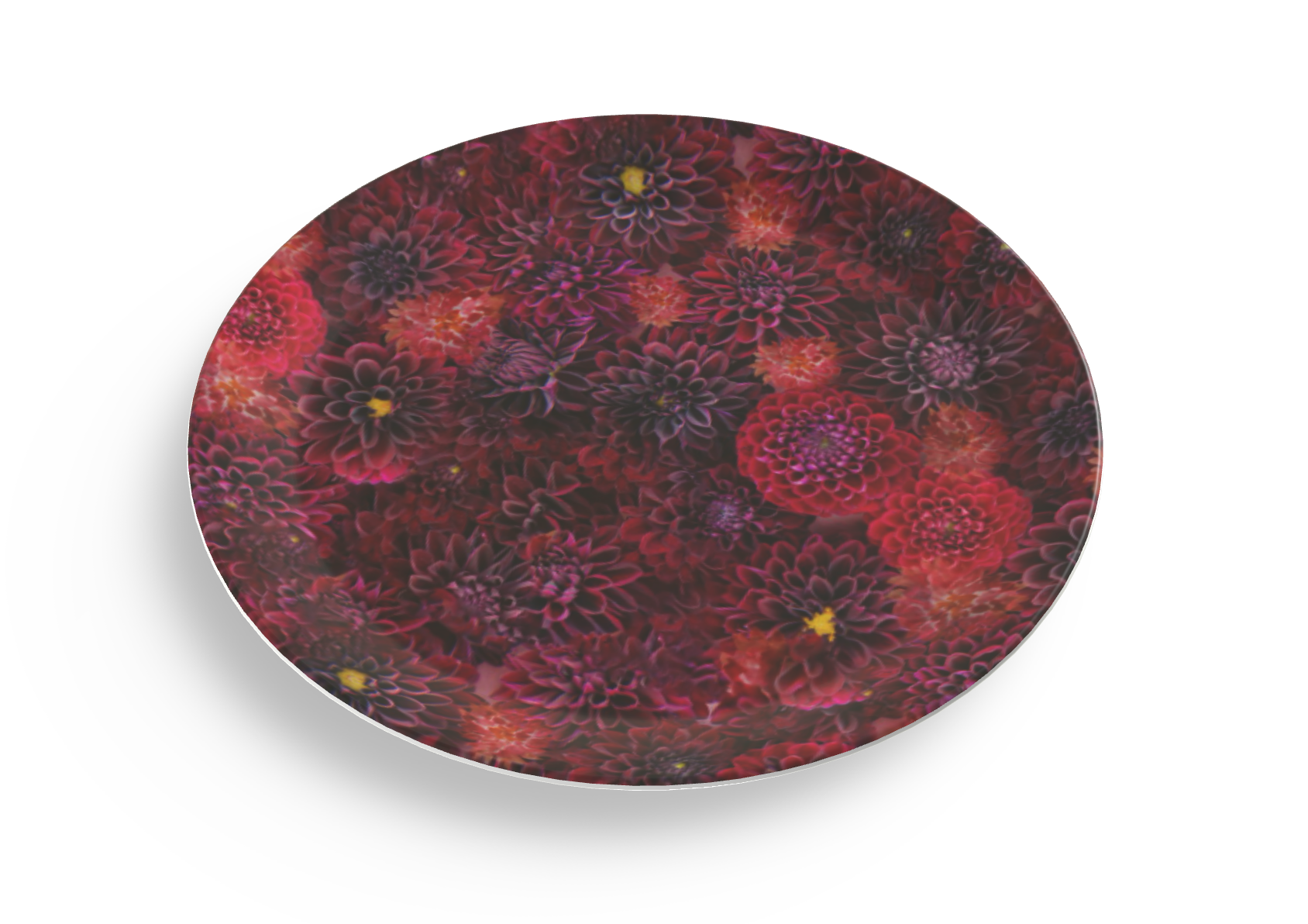 This is a set of 4 matching melamine plates. The red dahlia design, by Erin Gleeson, features flowers she photographed in California. These are perfect for dessert or appetizers at a party, or for kids!
